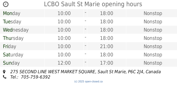 It is also possible to : Edit these OPENING HOURS of Store LCBO In Sault St Marie, 275 SECOND LINE WEST MARKET SQUARE,